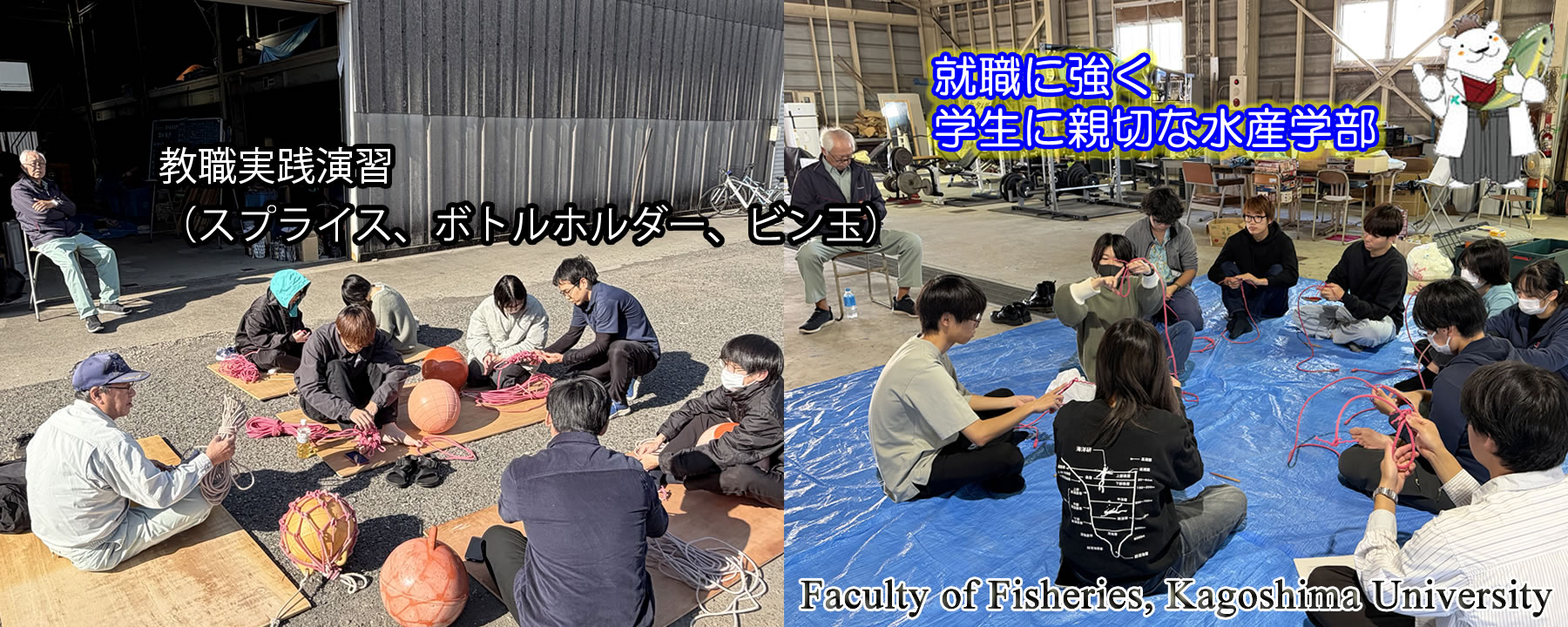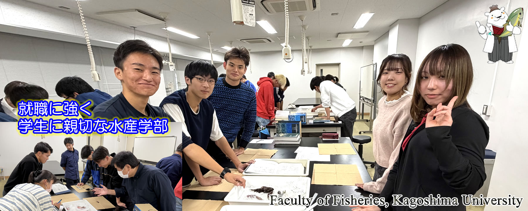 NEWS INFORMATION 2025/12/16教職員公募情報について【教職員、練習船】すべて 2025/09/17令和8年度鹿児島大学水産学部附属練習船 かごしま丸の共同利用の公募についてすべて 2025/03/28令和8年度入学者選抜(令和7年度実施)における選抜方法等について入試情報 MORE TOPICS すべて イベント 公開講座 国際 地域 学生 江籠遥香さん(食品生命科学分野4年)が日本水産学会九州支部大会にて支部長賞を受賞2025年12月11日かごしま丸が北里大学の学生を対象とした共同利用乗船実習を実施しました2025年12月5日水産学部3年生の秋山 航さんが学長表彰を授与されました2025年12月3日かごしま丸が宮崎大学の学生を対象とした共同利用乗船実習を実施しました2025年11月28日MORE鹿大理工学研究科学部技術部主催の第151回地域連携活動 「ものづくり体験教室2025」に水産学部技術部が参加しました2025年8月8日2025年度 夏季オープンキャンパスを開催しました2025年8月7日川内市内水面漁業協同組合による研修受け入れ2025年2月10日鹿児島大学水産学部附属練習船「かごしま丸」の出航式を開催2023年8月18日MORE内之浦小学校でイセエビ講座を実施しました2025年9月8日かごしま丸で宮崎大学の学生および小学生を対象とした防災学習と船内見学会が実施されました2025年3月28日公開講座「親子で冒険!かごしまの海2019」を開催しました2019年8月1日公開講座「海の生物の不思議~ダイオウイカを知ろう~」を開催しました2019年7月29日MOREかごしま丸が北里大学の学生を対象とした共同利用乗船実習を実施しました2025年12月5日特別講演会「東南アジアにおける水産業の現状と課題」を開催しました2025年10月22日熱帯水産学国際連携履修プログラム 海外派遣がスタート!2025年10月22日2025年度 ILP サマーセッションの閉講式が実施されました2025年9月29日MOREかごしま丸が宮崎大学の学生を対象とした共同利用乗船実習を実施しました2025年11月28日鹿児島市立八幡小学生が校区探検で水産学部を見学2025年11月25日島根県隠岐諸島・西ノ島町と漁業技術交流会を行いました2025年9月30日内之浦小学校でイセエビ講座を実施しました2025年9月8日MORE江籠遥香さん(食品生命科学分野4年)が日本水産学会九州支部大会にて支部長賞を受賞2025年12月11日かごしま丸が北里大学の学生を対象とした共同利用乗船実習を実施しました2025年12月5日水産学部3年生の秋山 航さんが学長表彰を授与されました2025年12月3日かごしま丸が宮崎大学の学生を対象とした共同利用乗船実習を実施しました2025年11月28日MORE