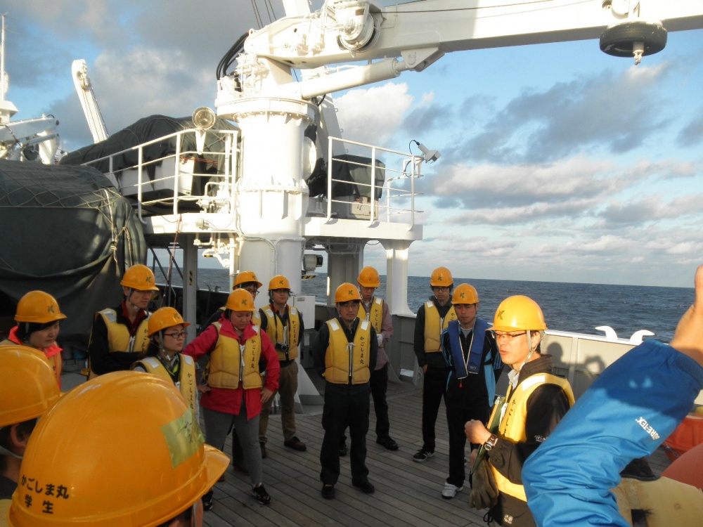 私たちは,この問題を解き明かすために,かごしま丸による海洋観測を,国内の4つの研究機関(九大応用力学研究所,愛媛大沿岸環境科学研究センター,富山大理学部,水産総合研究センター・東北水研)と共同で,今年度からはじめました。研究プロジェクト名を,「海洋混合学の創設(新学術領域研究)」といいます。第1回目の今年は,大学院洋上観測乗船実習(鹿大水産学研究科)と洋上セミナー(連合農学研究科)で乗船した修士課程(7人)と博士課程(4人)の学生とともに,研究グループから総勢20人が参加して,11月14日~22日まで観測を実施しました。この観測で取得したデータは,研究者のみならず修士・博士課程の学生の研究として,世界的な成果を目指して解析されます。