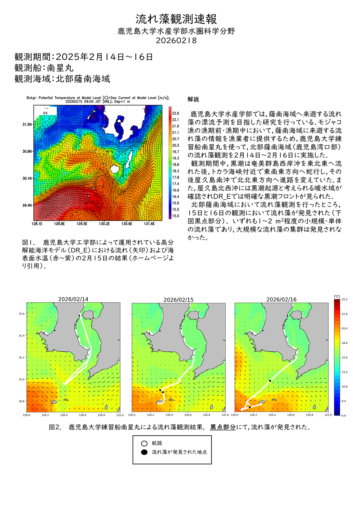 観測速報研究2026年2月14日~16日に北部薩南海域で実施した練習船「南星丸」による流れ藻の目視観測による速報です。(2026年2月18日掲載)