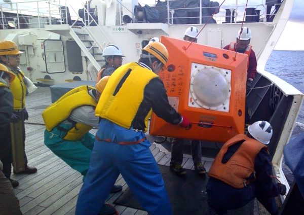 実習では、出港後すぐに鹿児島湾口部でTwin-NORPACネットによるプランクトン採集、採泥器(Smith-Mcintire Bottom Sampler)による底質・ベントスの採集、CTD-CMS及び乱流計(TurboMAP:Turbulence Ocean Microstructure Acquisition Profiler)による海洋観測を行いました。その後、九州西方海域に移動し、10日は甑島周辺でCTD観測、11日~15日は 大陸棚域および男女群島付近で前述の機器を用いた採集・観測に加えて、係留系(海底設置型ドップラー潮流計TRBM: Trawl-Resistant Bottom Mount)の回収及び再設置を行い研究に必要な観測データを収集しました。観測最終日の16日には鹿児島湾口部の2点で係留系(TRBM)の回収を完了し、午後には谷山港に着岸しました。帰港後は、今航海で取得したデータの整理を行うと共に、乗船した研究者によるセミナーが開催されました。