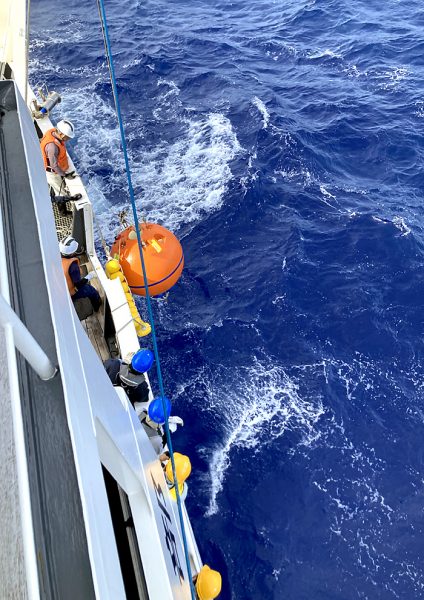 実習はLeg1(6/7-6/14)とLeg2(6/15-6/22)の2部構成で実施され、Leg1ではトカラ海峡西方の観測点から南下しながら倒立型音響測深機(CPIES)の回収作業を4点、係留型流速計の回収4点および設置2点、その他CTDおよびXCTDによる海洋観測、GPDブイの投入によるデータ収集を行い、終了後は与論島茶花港に向けて航行しました。