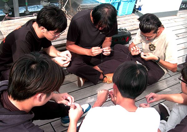 2日目の午前中は2班に分かれて機関室と船橋・甲板外回りの見学を行いました。午後からは安楽教授からのトロール操業についての講義と三橋准教授の指導により立縄操業に使用する仕掛け製作を行いました。3日目、4日目は漁場に到着後、合計4回の着底トロール操業及び漁獲生物の選別・計測を行いました。5日目は午前中に宇治群島周辺海域での立縄操業とロープワーク実習を行い、午後からは船橋での操舵実習を行いながら鹿児島湾に向け航行しました。6日目は湾内でのCTD観測と船内清掃を実施し、13時過ぎに谷山港に入港しました。入港後、学生達は本航海で得た実習資料の分析等を行い、翌日9時過ぎに下船しました。