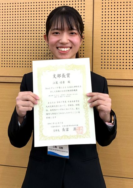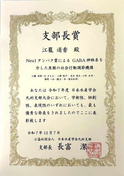 食品生命科学分野4年生(塩崎研究室所属)の江籠遥香さんが、12月6日に長崎大学で開催された日本水産学会九州支部大会において、九州支部長賞を受賞しました。本賞は、発表者の中から最も優秀な発表を行った1名のみに授与されるもので、学部生による受賞は稀であり、高い評価を得た成果となりました。