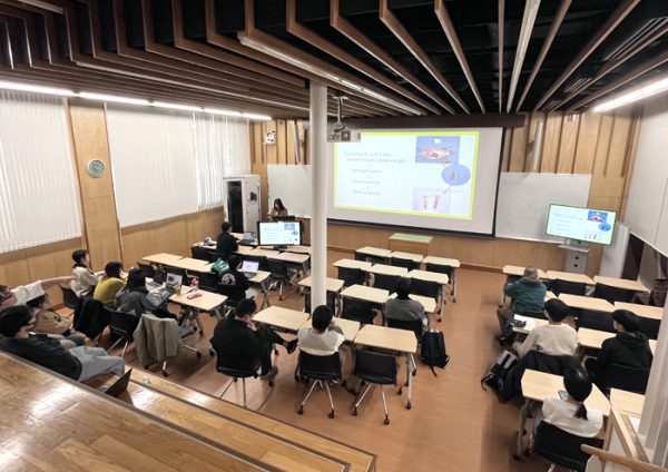 報告会は鹿児島大学水産学部の図書館セミナー室で対面形式により実施し、カセサート大学大学院の教員はオンラインで参加しました。会場には、次年度以降に海外派遣の参加を検討している学部生やこれまでの派遣学生が集まり、熱心に耳を傾けていました。